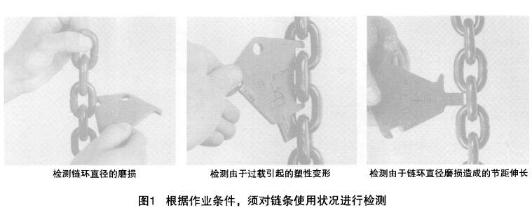 (3)檢查鏈環磨損及伸長:用生產廠商提供的標牌進行簡單檢測 (見圖1 ) 。